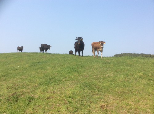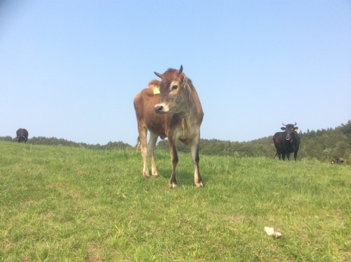 放牧地の管理人さんが、ずっとくっついて回るジャージーたちを