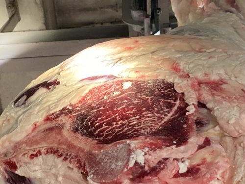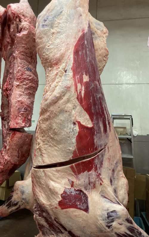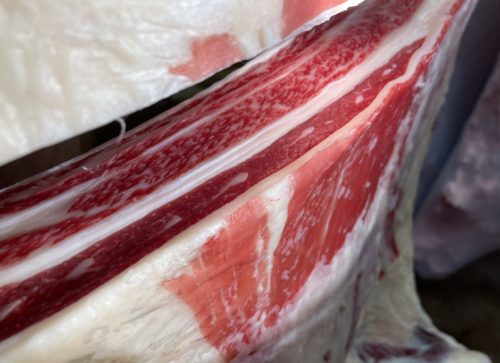 感じるのだけど、後ろにいる通常肥育の枝肉の脂の色と比べると、