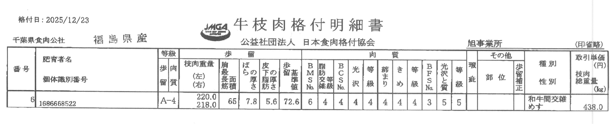 12月下旬に出荷をして、枝肉の状態で