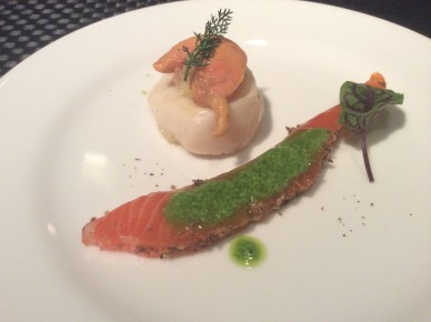 アミューズの八幡平サーモンとホタテのコンフィ。