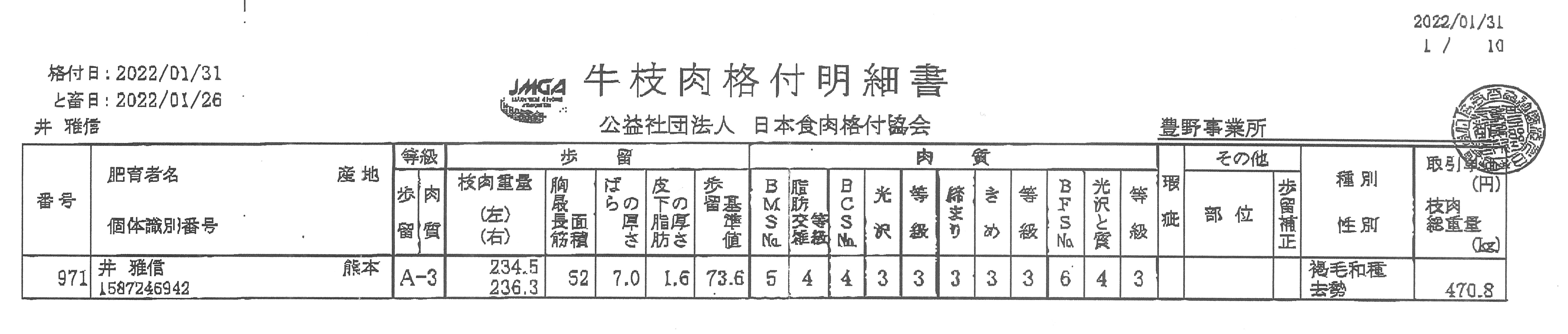 今回の井さんあか牛35.6カ月齢♂ですが、枝重量470㎏で、